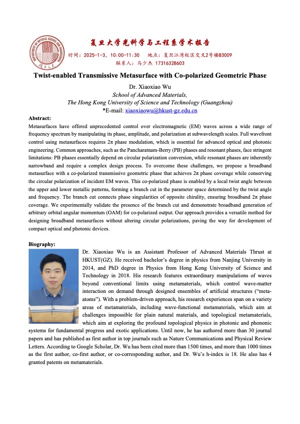 【学术报告】Twist-enabled Transmissive Metasurface with Co-polarized Geometric Phase